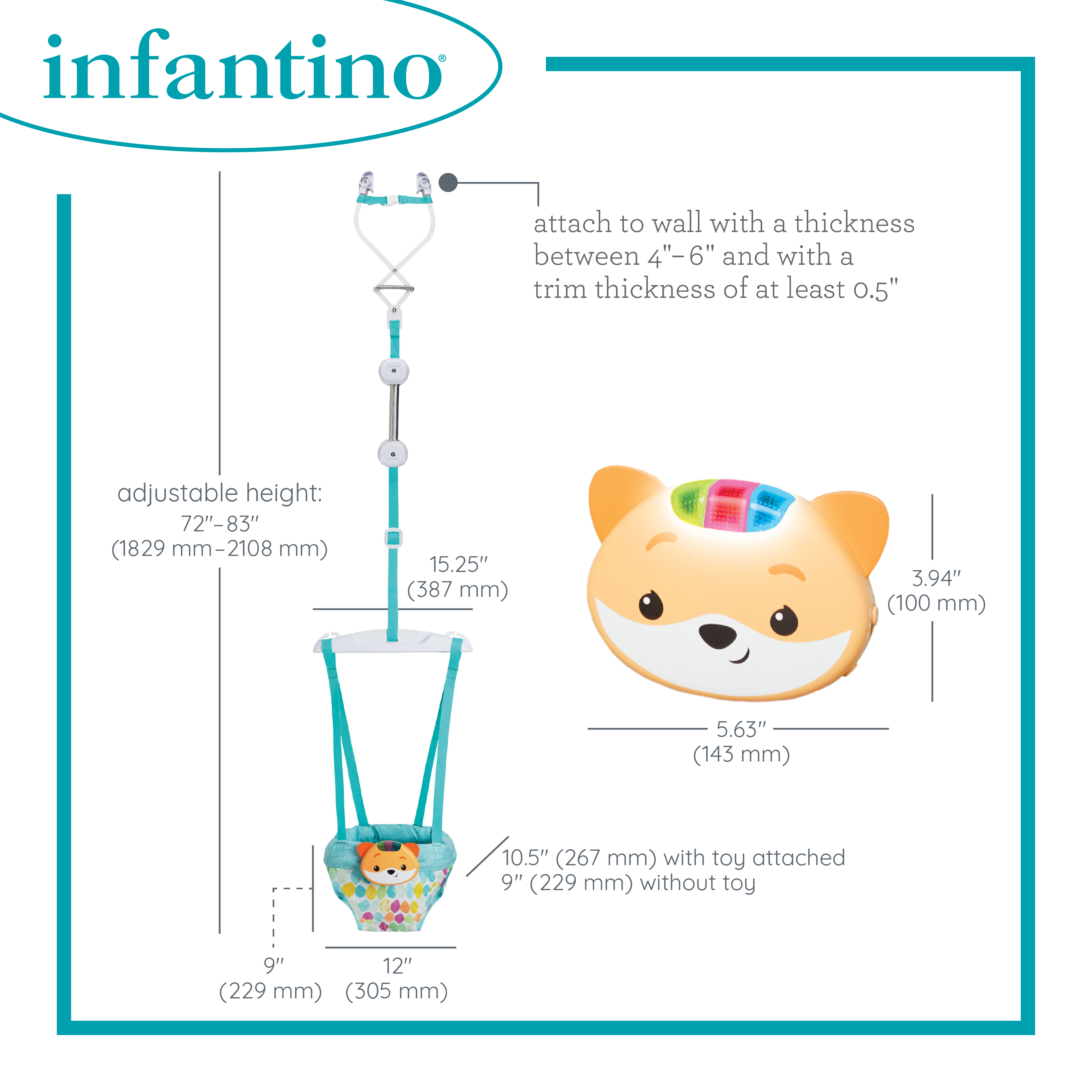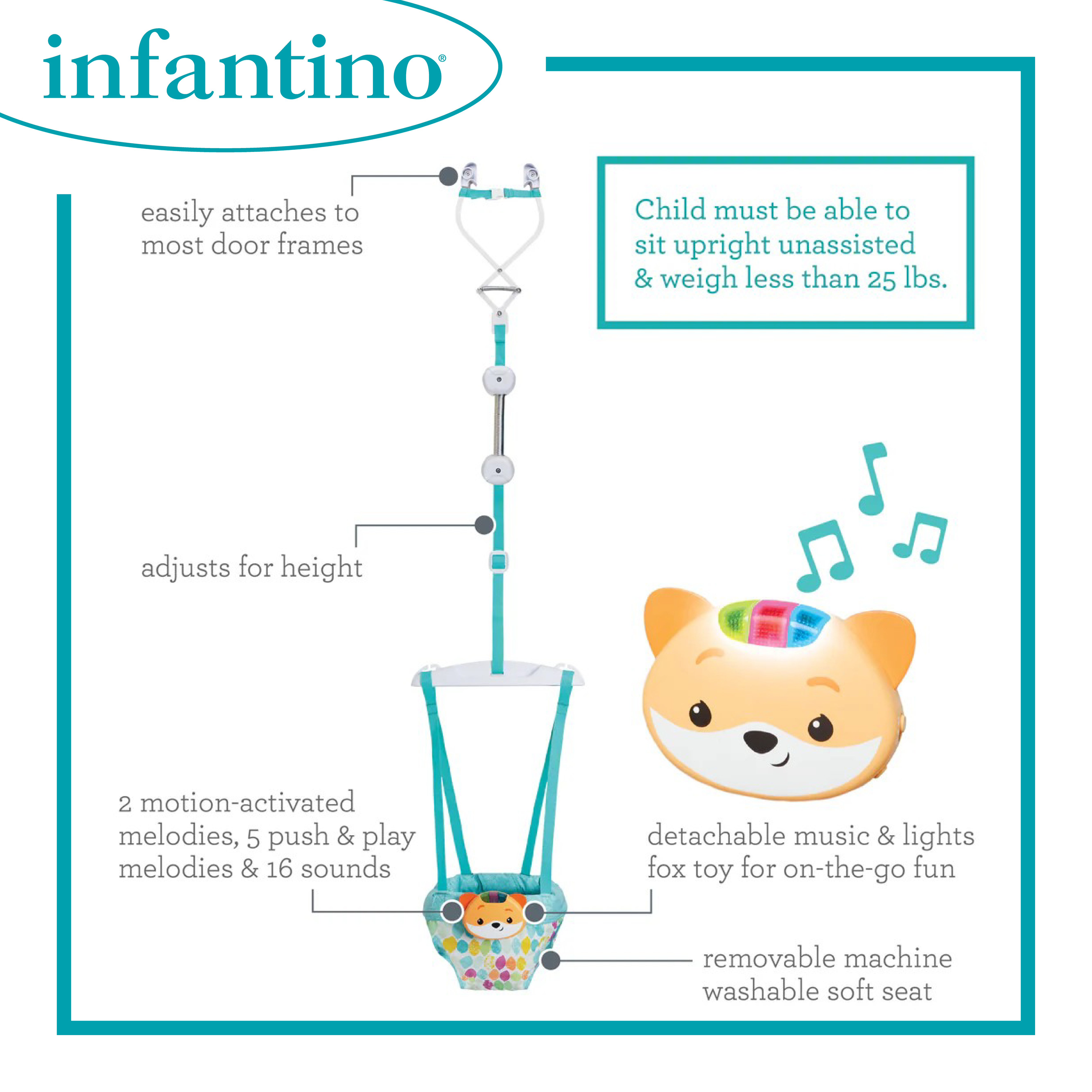 適合4個月以上嬰兒使用 透過刺激的彈跳活動促進寶寶的身體發育,提升運動技能 讓您的小寶貝沉浸在互動音樂和迷人燈光的世界中, 這款動作啟動的狐狸玩具會隨著每次動作而動作 寬肩帶設計,輕鬆幫寶寶穿上脫下跳椅,帶來極致便利 柔軟且可機洗的座椅易於清潔,確保寶寶的舒適 輕鬆將這款跳線連接到大多數門框上,方便在家中使用 拆下音樂狐狸玩具,隨時隨地享受樂趣