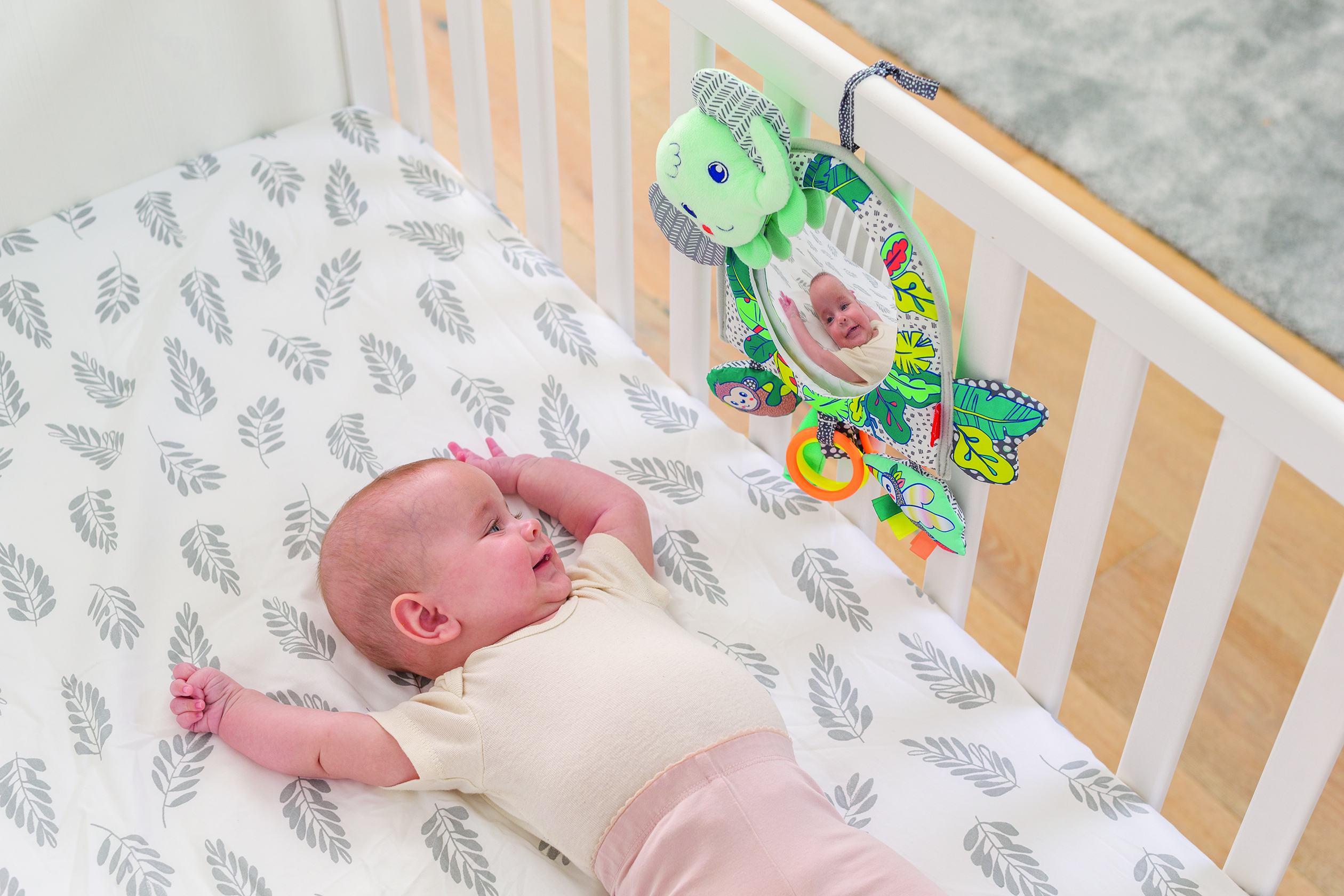適合初生嬰兒使用 大圓頂後視鏡提高車內可見度 大夾子方便附在嬰兒車車柄上 也可支撐在地上耍玩 同時帶子可輕易掛在嬰兒床 有趣動物圖案及顏色及質感