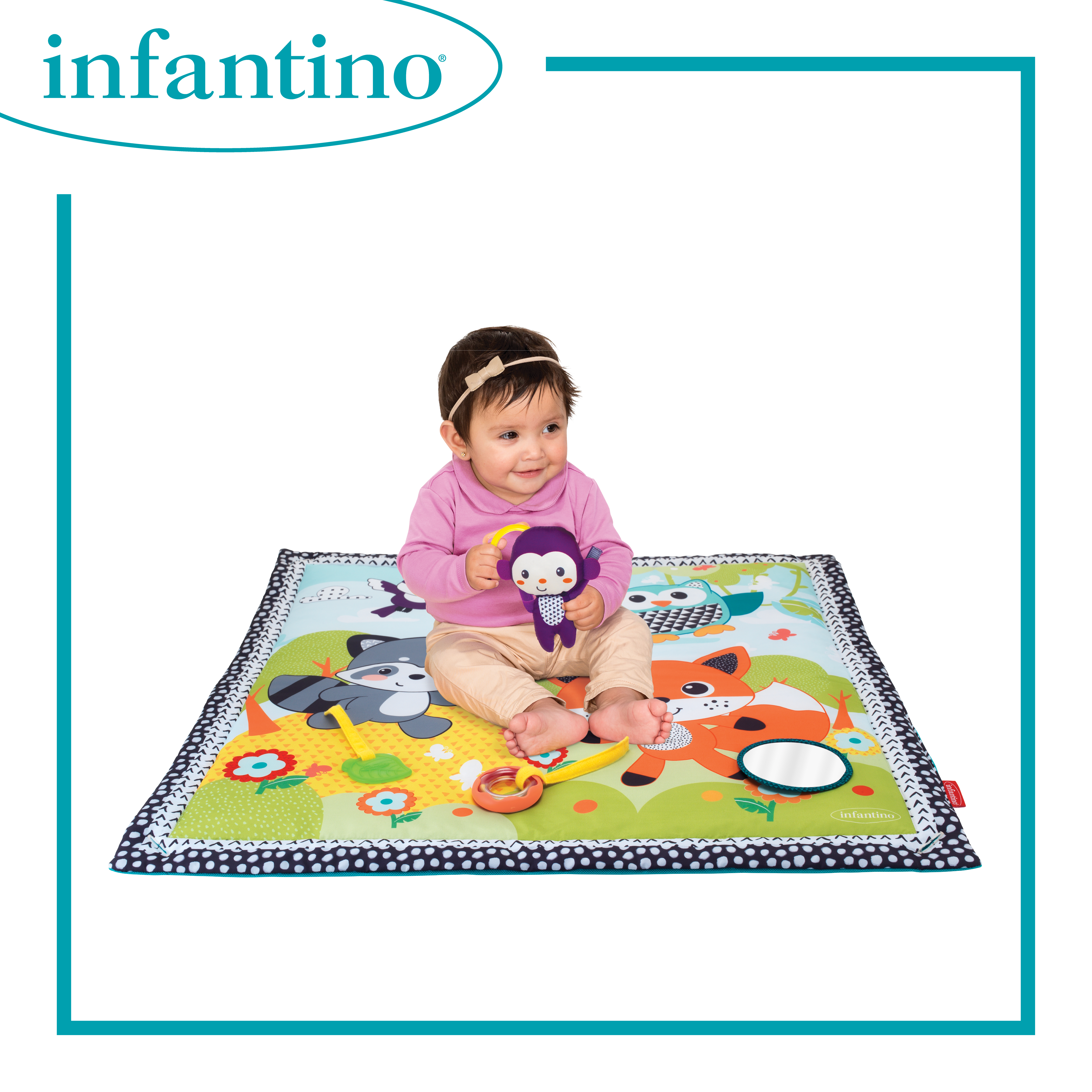 適合初生嬰兒使用 備有牙膠、小猴子、捉迷藏鏡子等共五件可拆式玩具 不含BPA 玩墊可摺疊易於收藏及攜帶,是旅行的好幫手