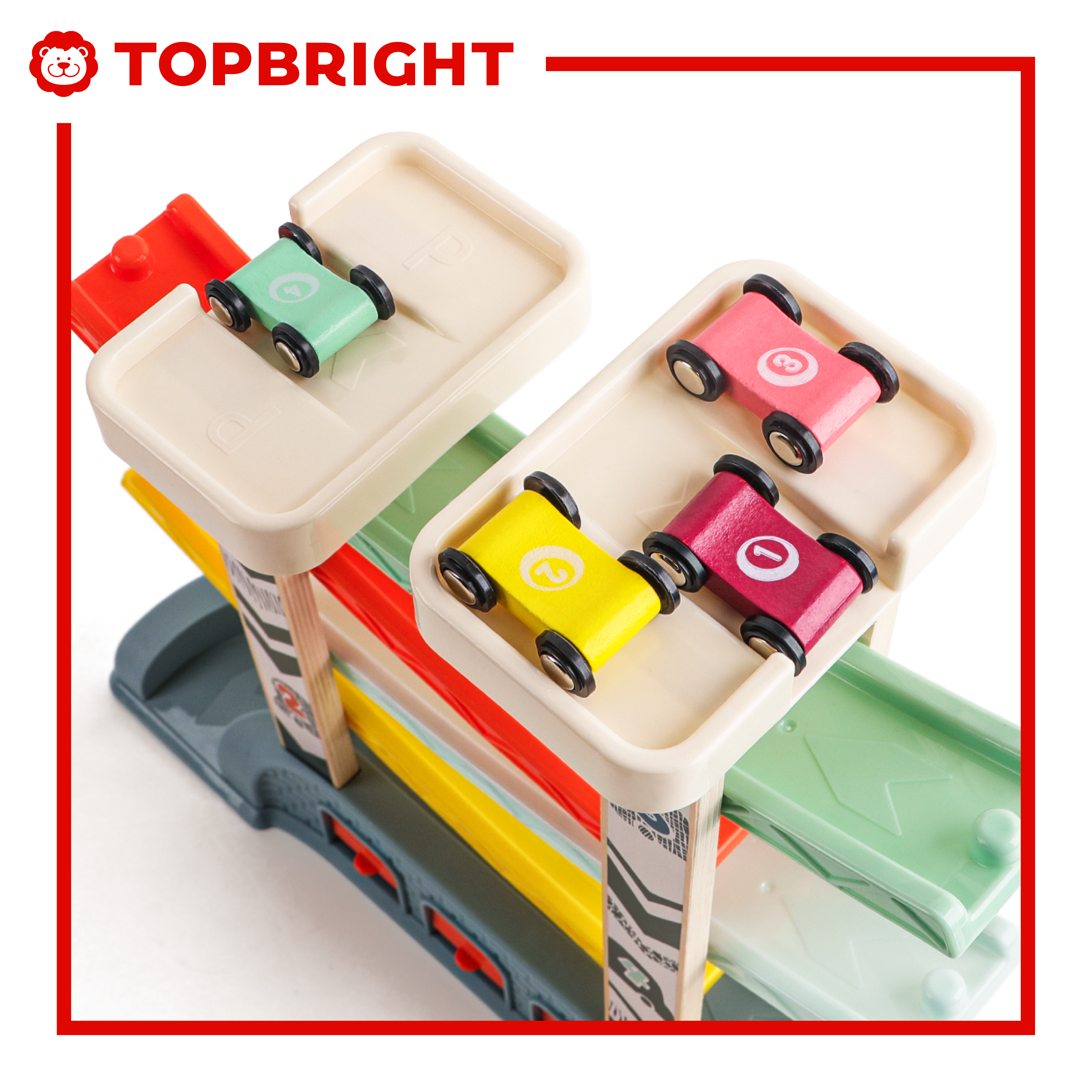 玩具車可以同時從停車場出發,然後順暢地滑下彩虹賽道,模擬真實的交通狀況。