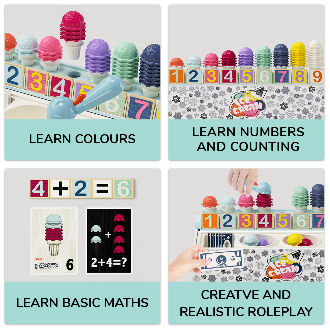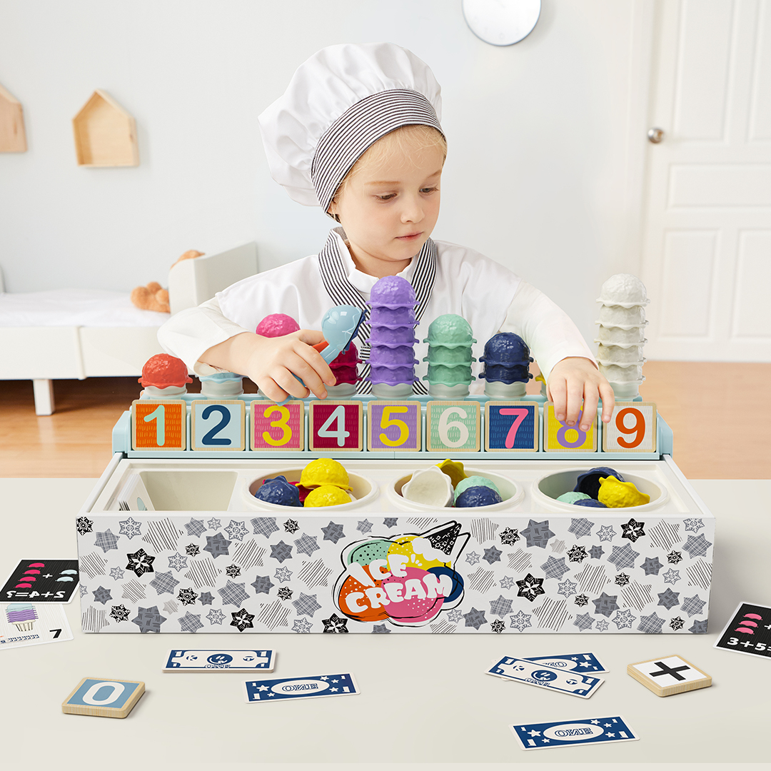 它包含許多數字牌,甚至還有玩具錢幣,寶寶在學習基本數學技能的同時,也能享受其中的樂趣。小小老闆可以透過搭建色彩繽紛的雪糕甜筒來計算數字的加減法,並核對答案。