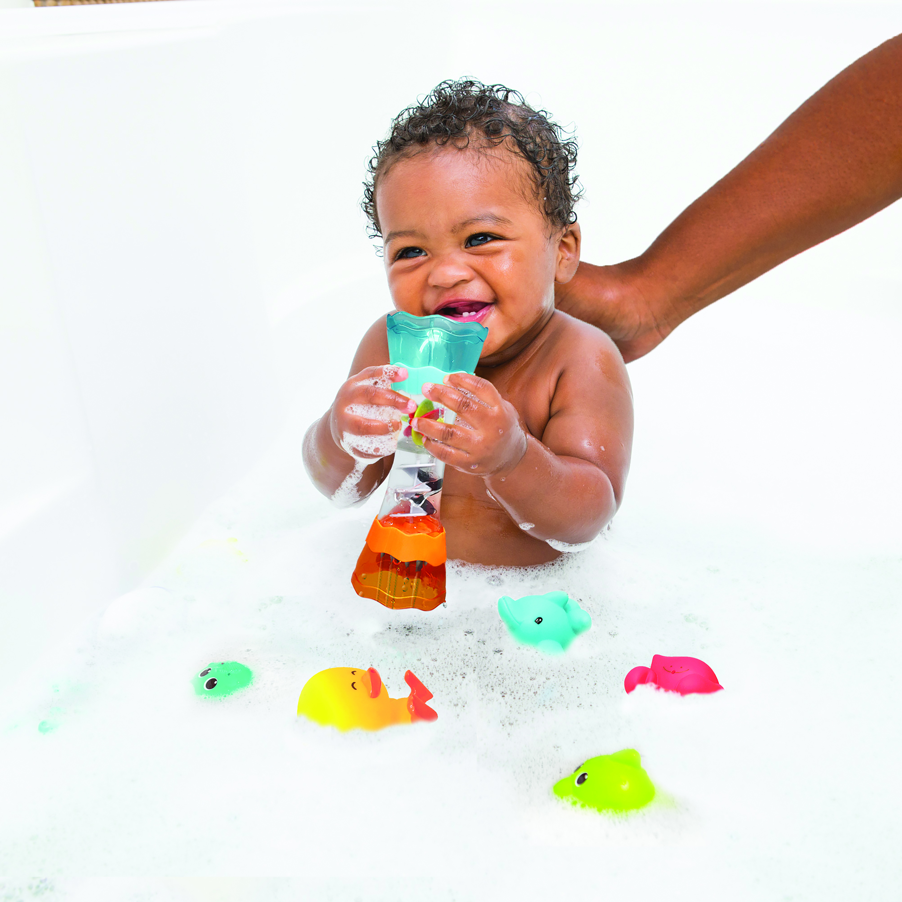 適合初生嬰兒使用 以海洋生物為主題的可疊放杯子採用1-8號數字, 而帶孔的底部允許運水玩水 釣魚用具配有大鉤子,適合孩子們釣魚, 而將魚分開可輕鬆清潔 裝滿水魔杖,並觀看它旋轉和流動, 以一種引人入勝的視覺方式介紹引力的概念 4個俏皮的噴水器為觸覺探索提供了有趣的紋理