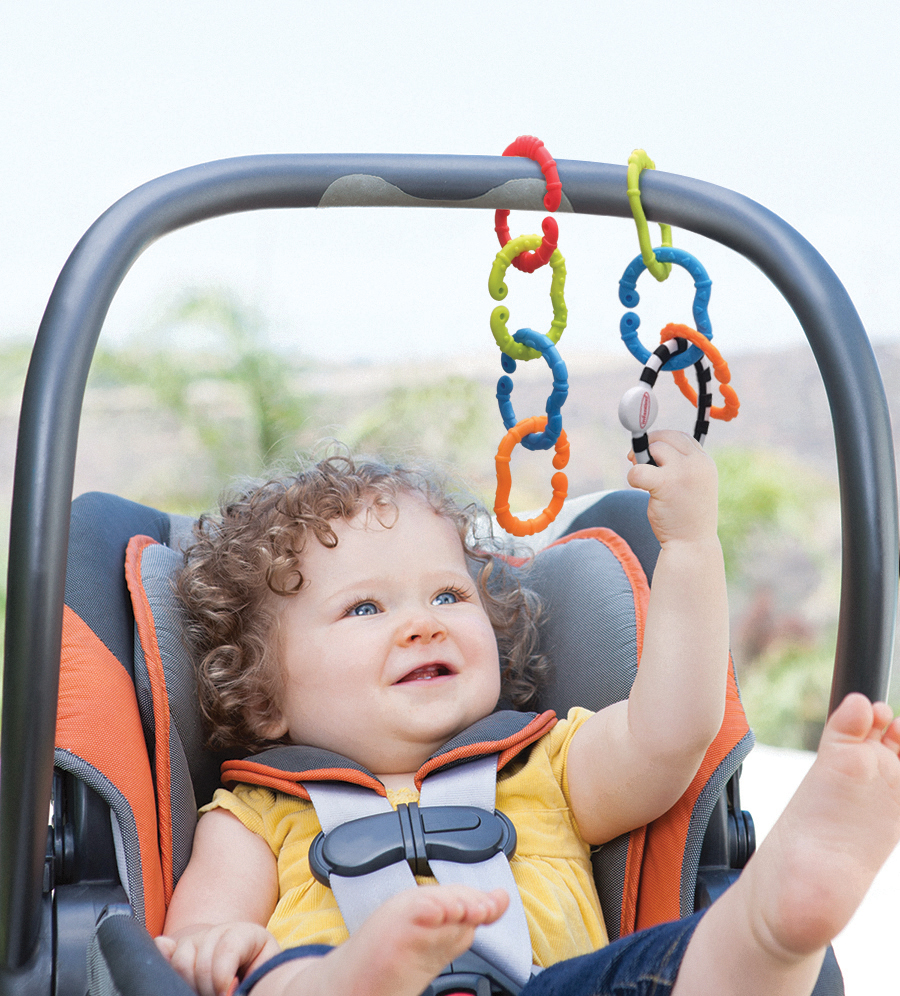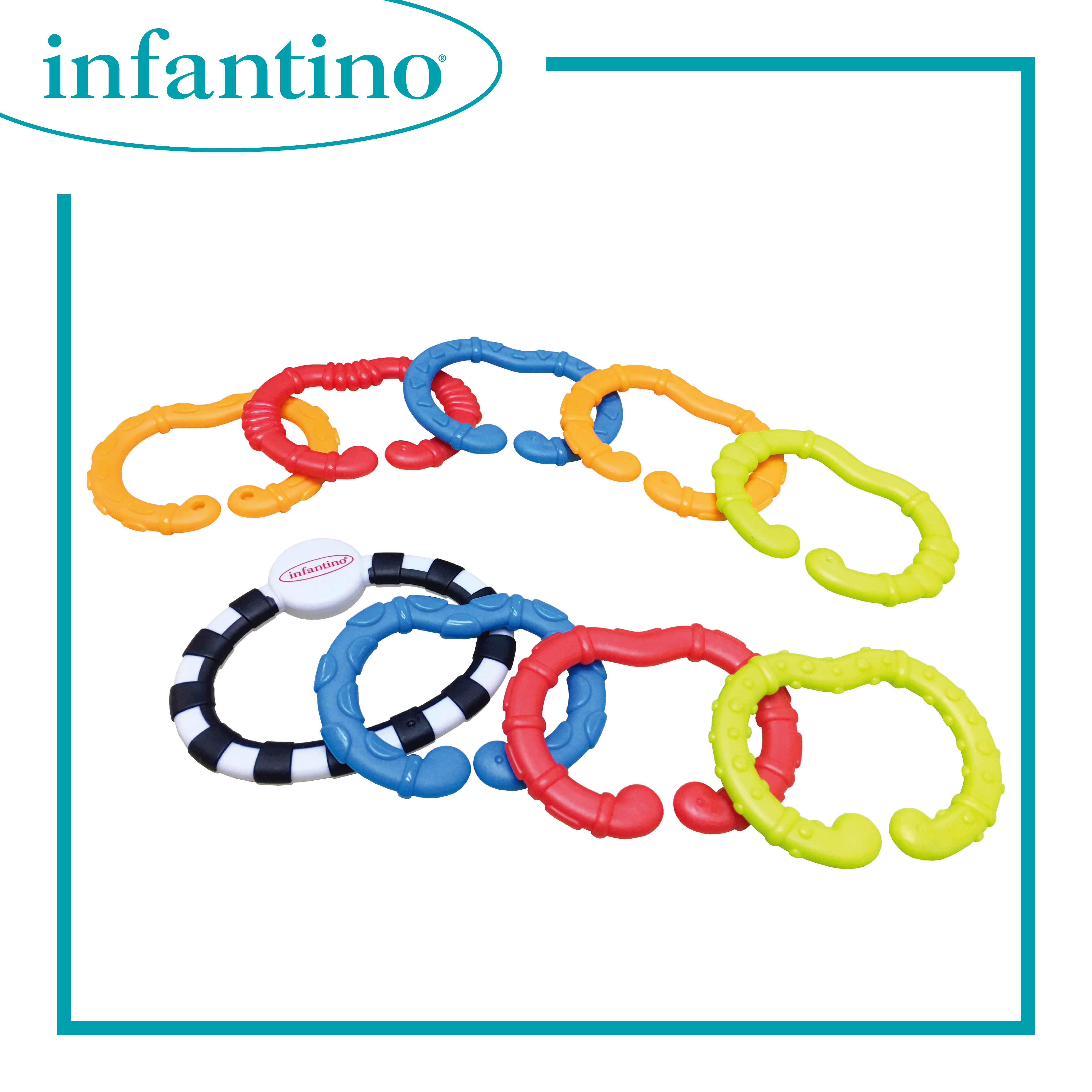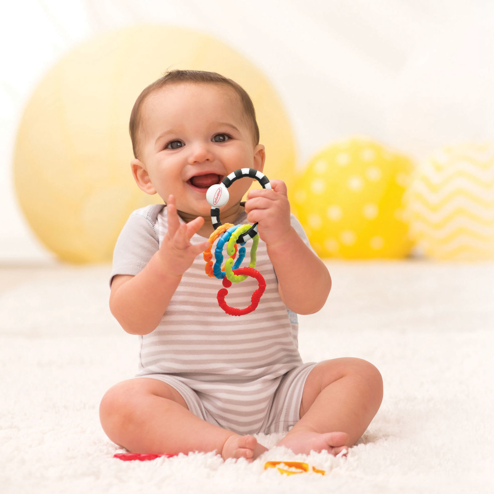 適合初生嬰兒使用 串連一起形成有趣的圖案 專為創意遊戲而設計 每個可拆卸圓環的結構均可激發寶寶觸感 9個圓環以不同顏色及質感設計,輕咬並咀嚼以舒緩寶寶的牙齦