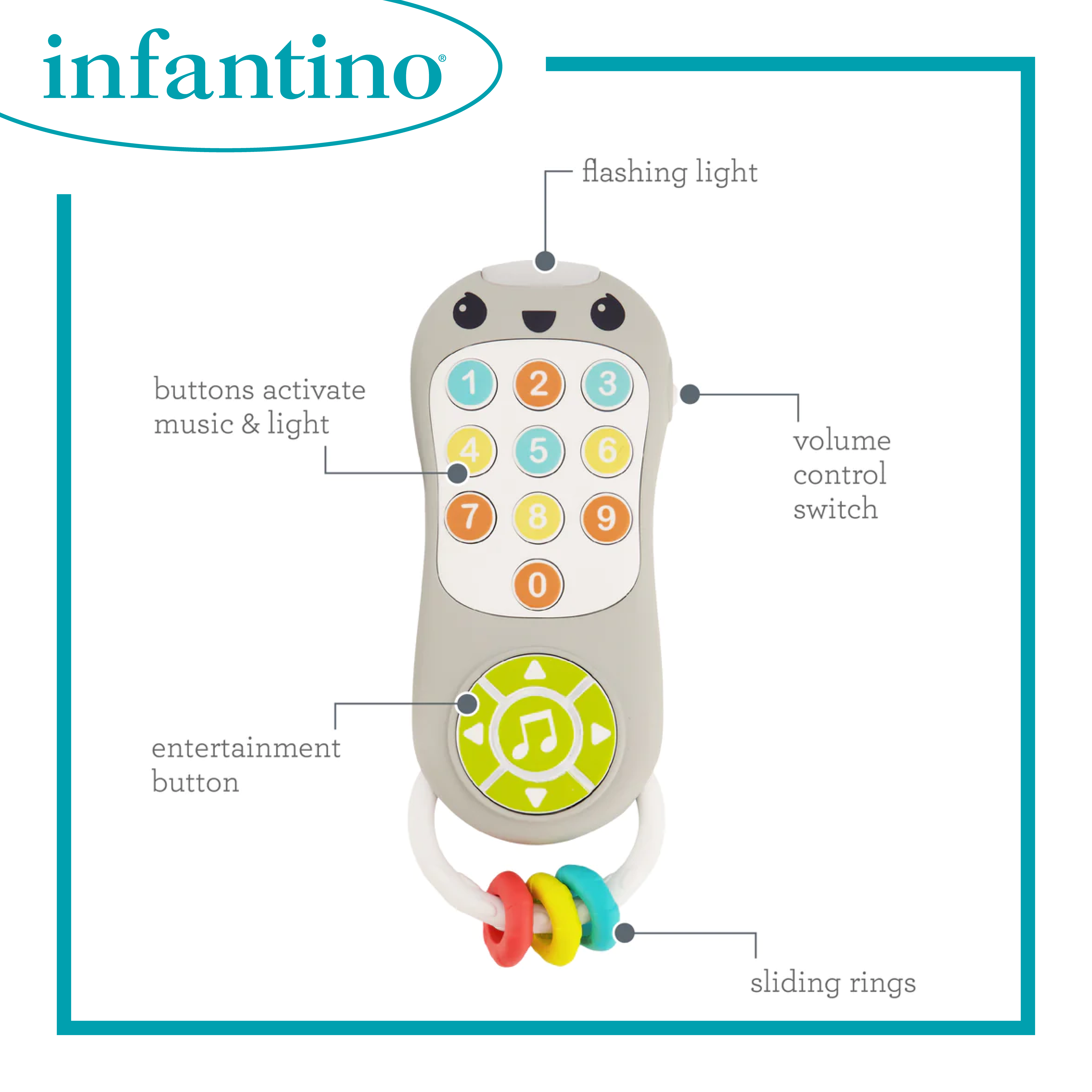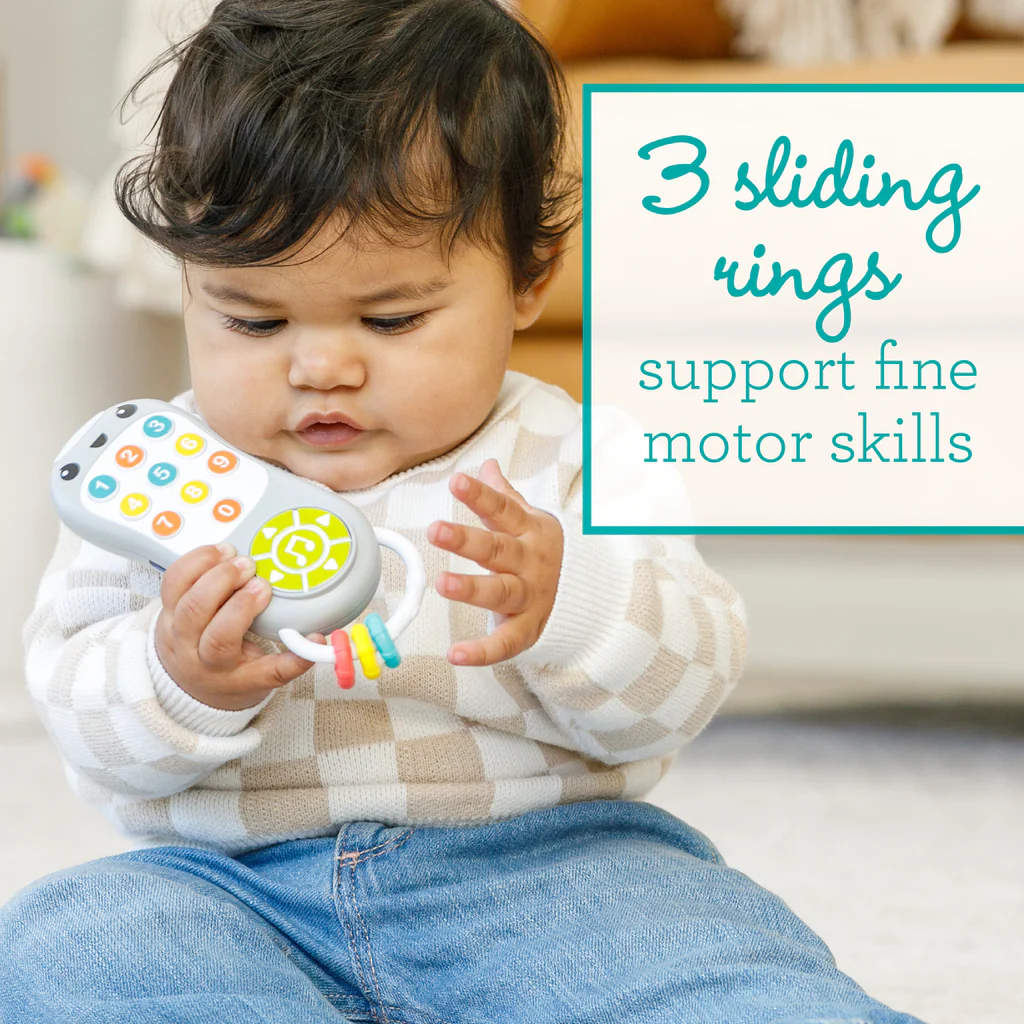 適合6個月以上嬰幼兒使用 提早介紹角色扮演遊戲 按下按鈕即可啟動音樂和燈光 10 個必按的頻道按鈕 1 個大型娛樂按鈕 3 個感官滑動按鈕 易於握持和連接,方便隨時隨地玩耍